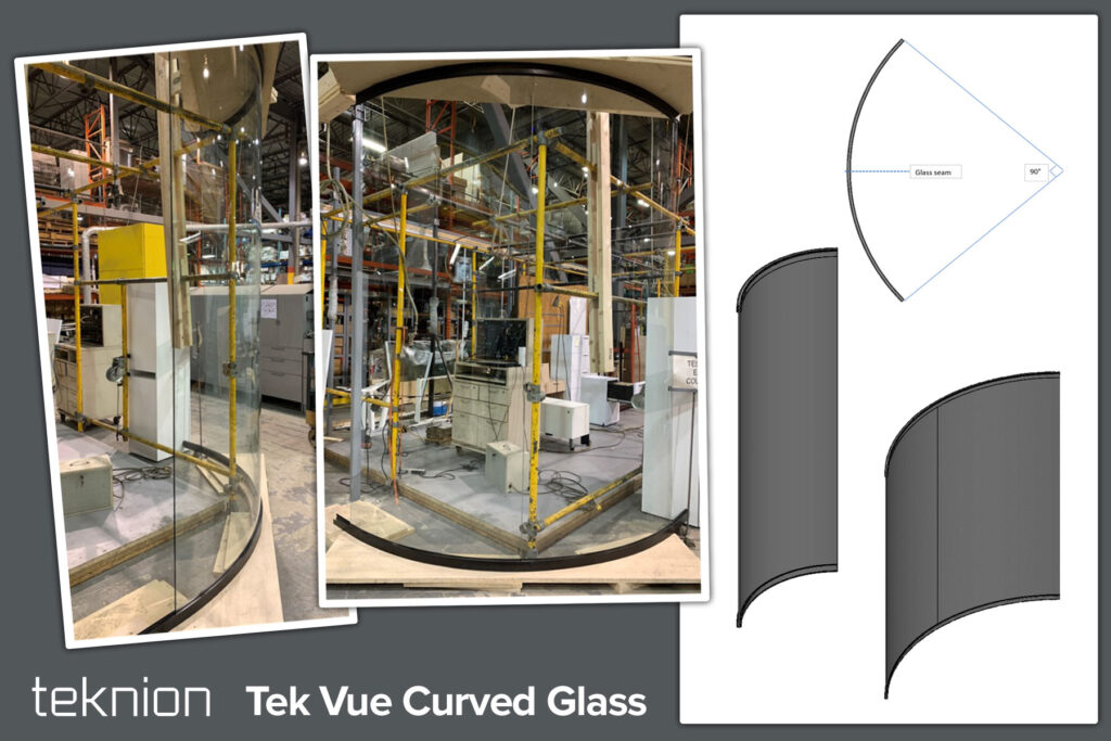 Want a curved transition between walls instead of a sharp angle? Tek Vue is now available with curved glass that accommodates angles of 90° or more between walls with radius between 30″ and 75″. For radius from 30″ to 36″, only one piece of glass is required for a 90° angle. For walls between 36″ and 75″, two pieces of glass are used with a discrete tape & clear connector transition between pieces.