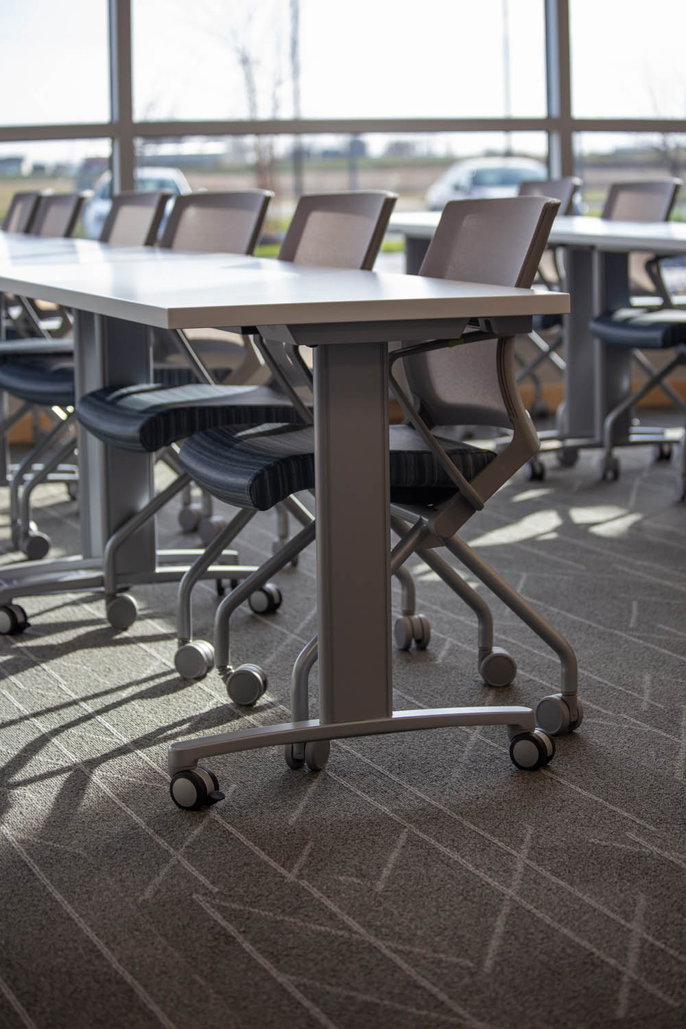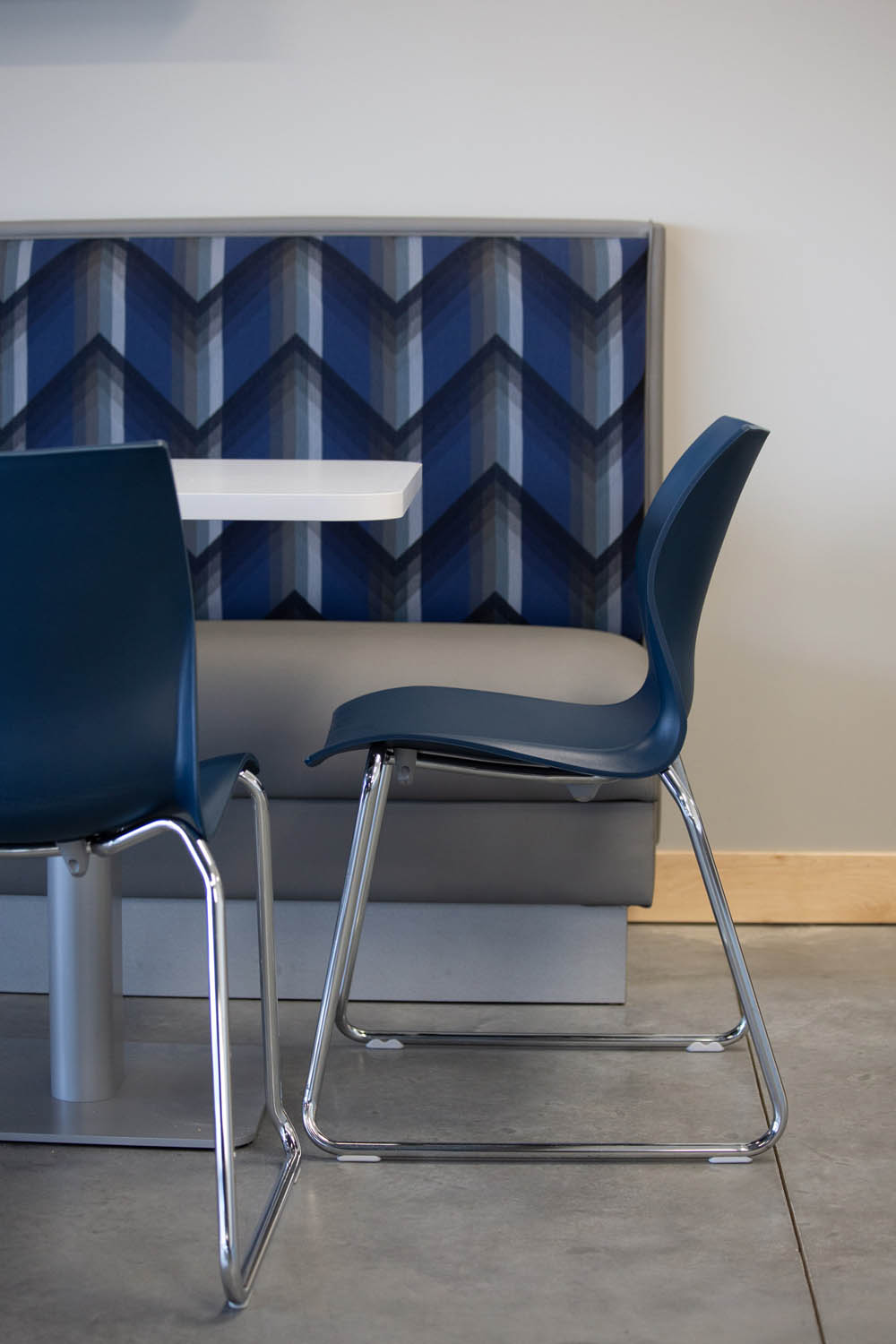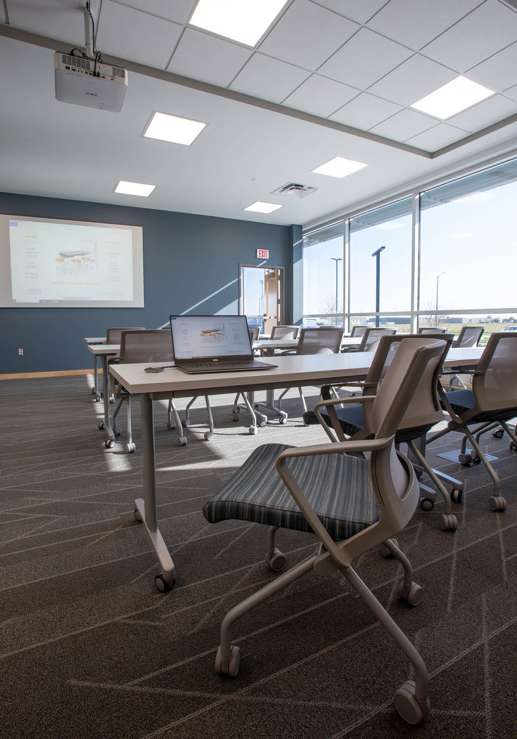 To the right of the main entry is another cluster of workstations and private offices, plus the high-traffic kitchen and cafe spaces furnished with Falcon booths and Teknion tables & Nami Chairs. A larger training/multipurpose space fit or all-company gatherings and training sessions is equipped with iSPACE meeting technologies and controls (including a ceiling-mounted NEC projector), portable Teknion Expansion Training Tables, and SitOnIt Movi Nester Chairs which can be easily “nested” to add flexibility in the space.