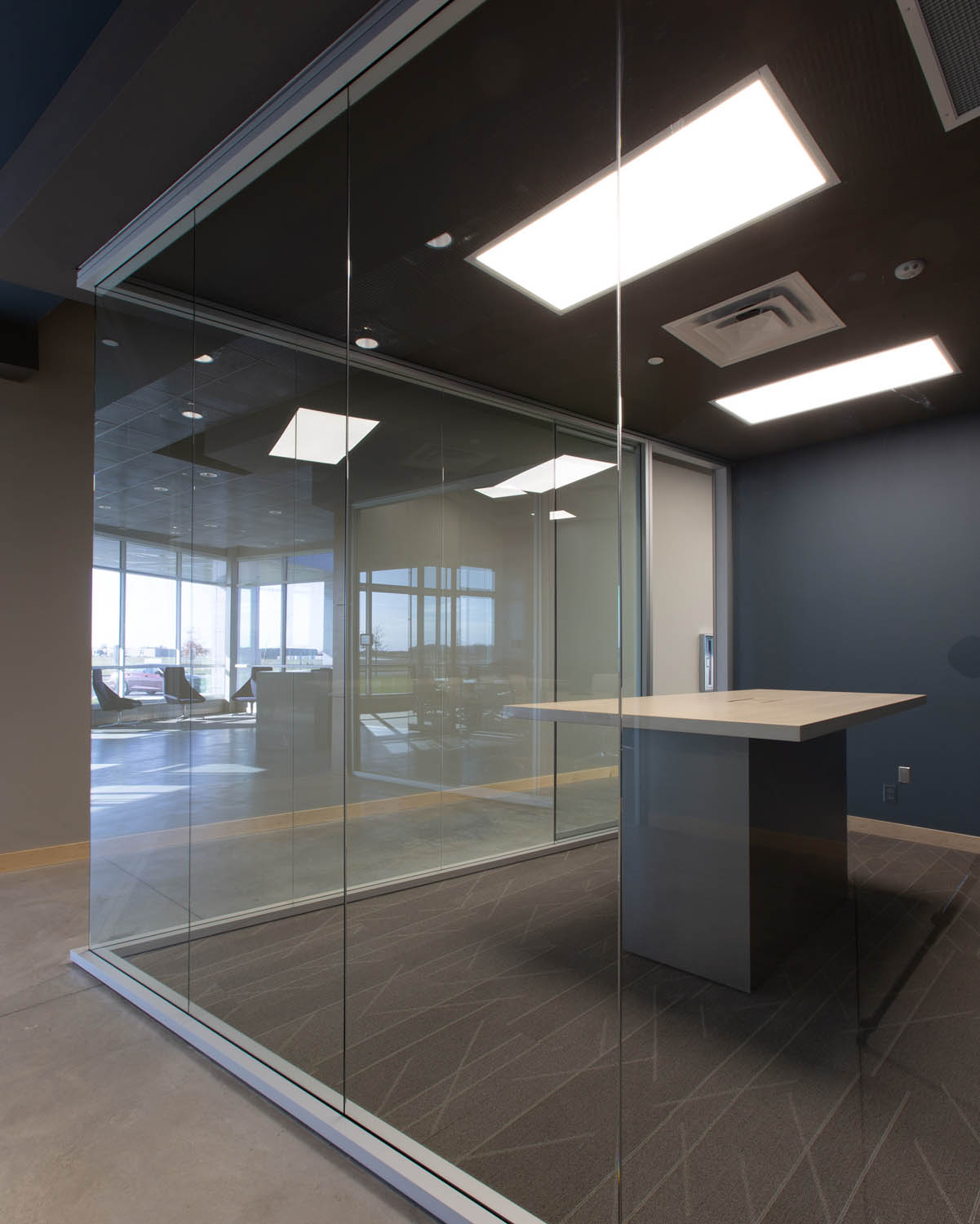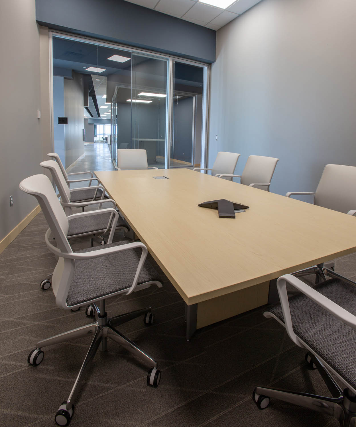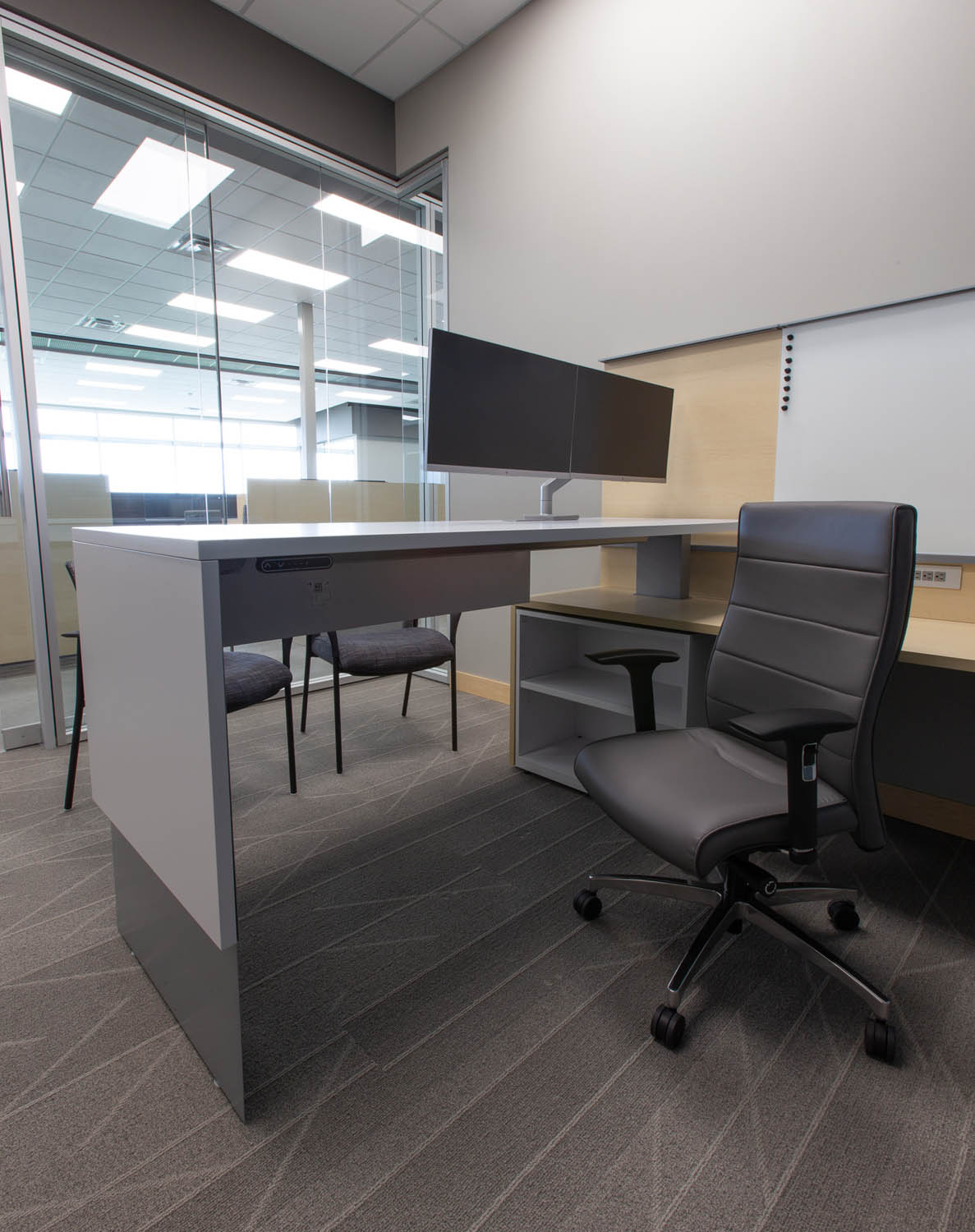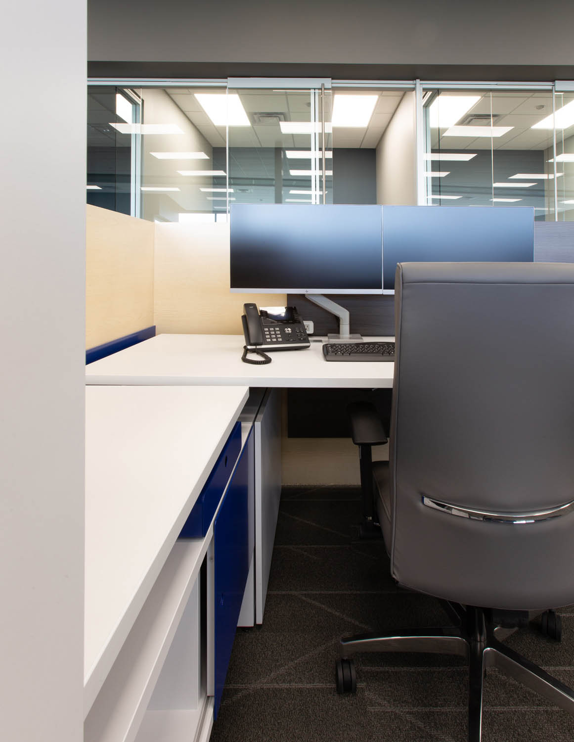 Just to the left is the main, open plan work area where more Optos glass walls create a flight of private offices overlooking semiprivate Teknion Expansion Cityline workstations equipped with height-adjustable desks and Humanscale monitor arms. The Cityline “beams”–customized with a touch of Blue Star Power Systems blue–provide convenience power and connectivity along with ample storage and accessory spaces. PCU’s are mounted under worktops to further reduce clutter in the open space.