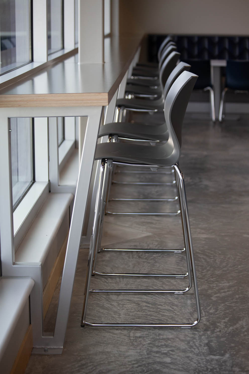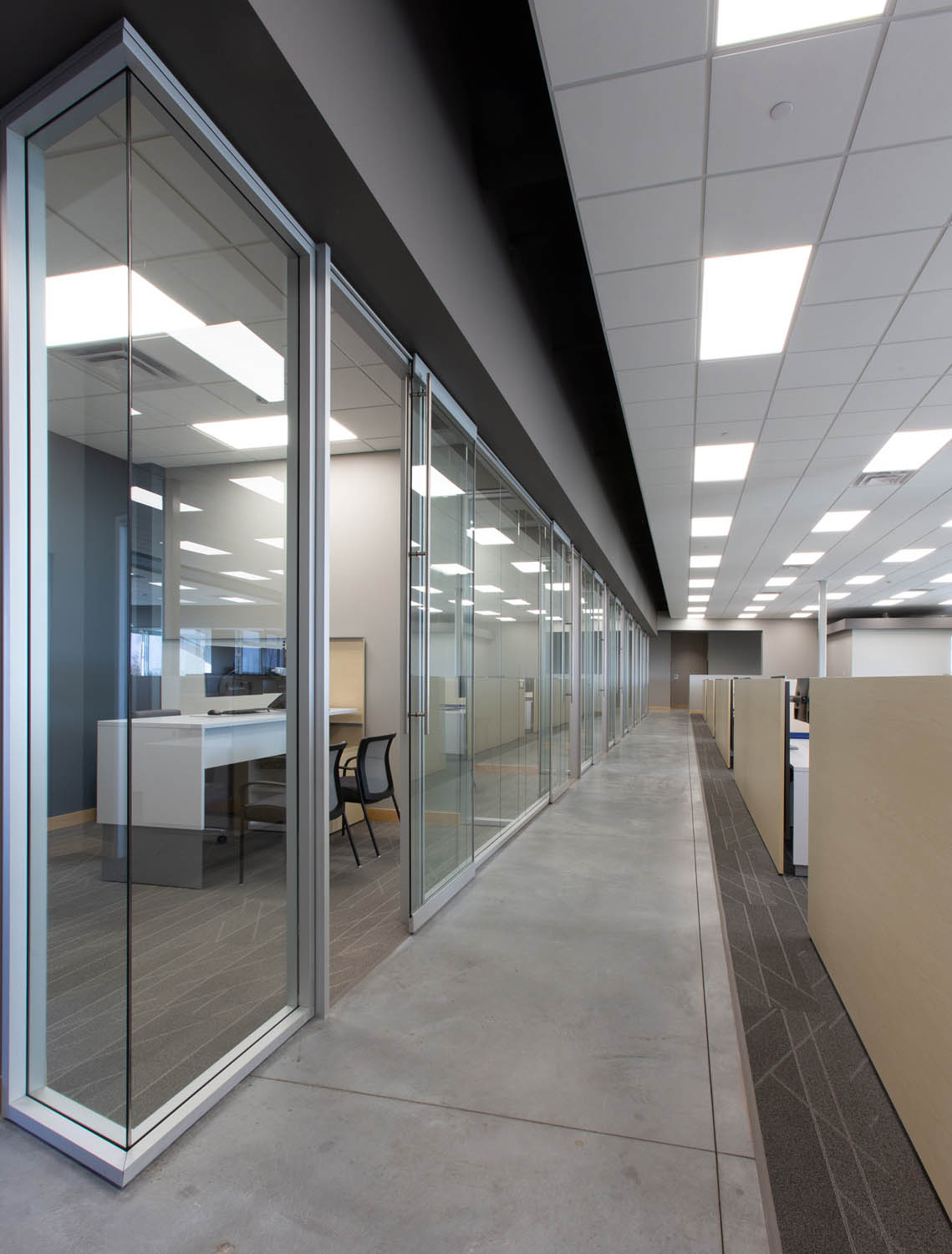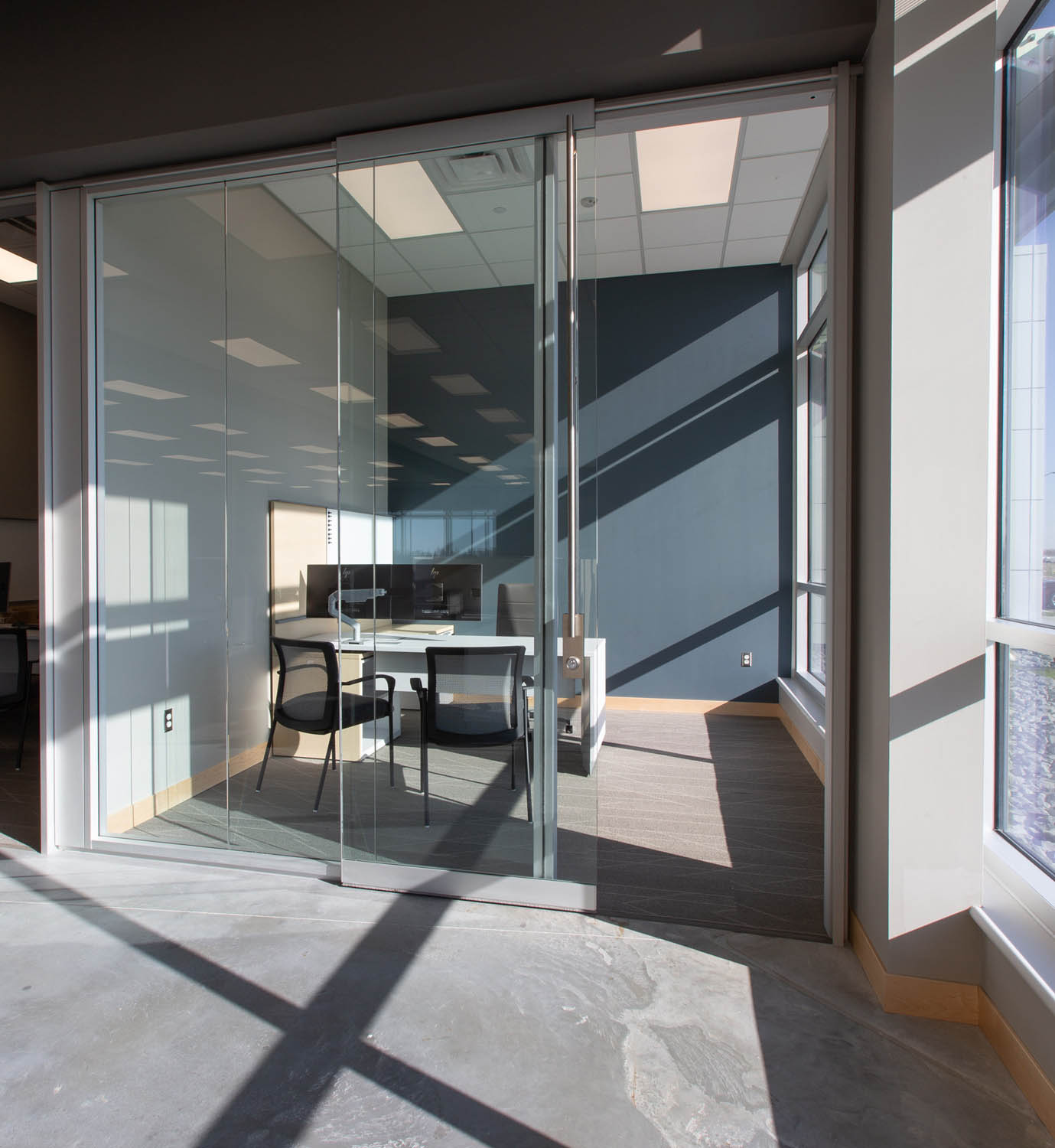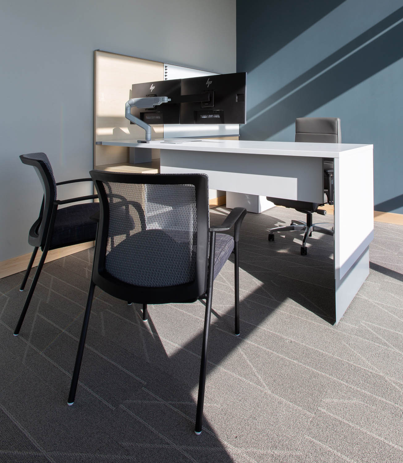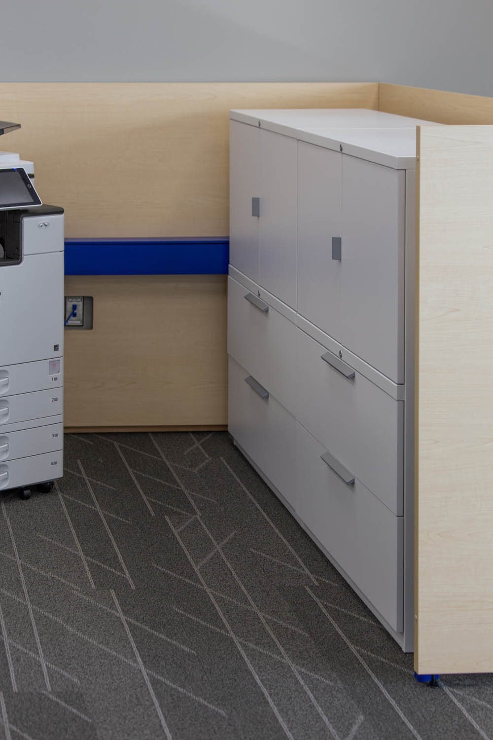 Just to the left is the main, open plan work area where more Optos glass walls create a flight of private offices overlooking semiprivate Teknion Expansion Cityline workstations equipped with height-adjustable desks and Humanscale monitor arms. The Cityline “beams”–customized with a touch of Blue Star Power Systems blue–provide convenience power and connectivity along with ample storage and accessory spaces. PCU’s are mounted under worktops to further reduce clutter in the open space.