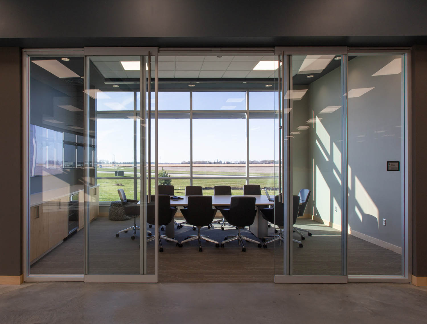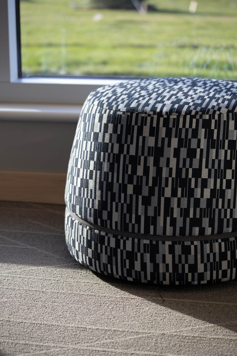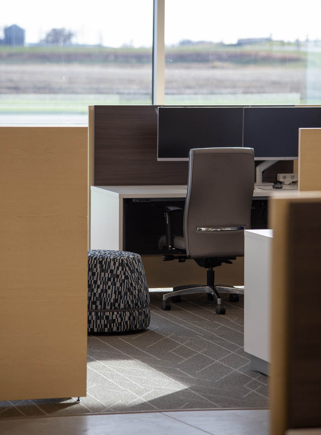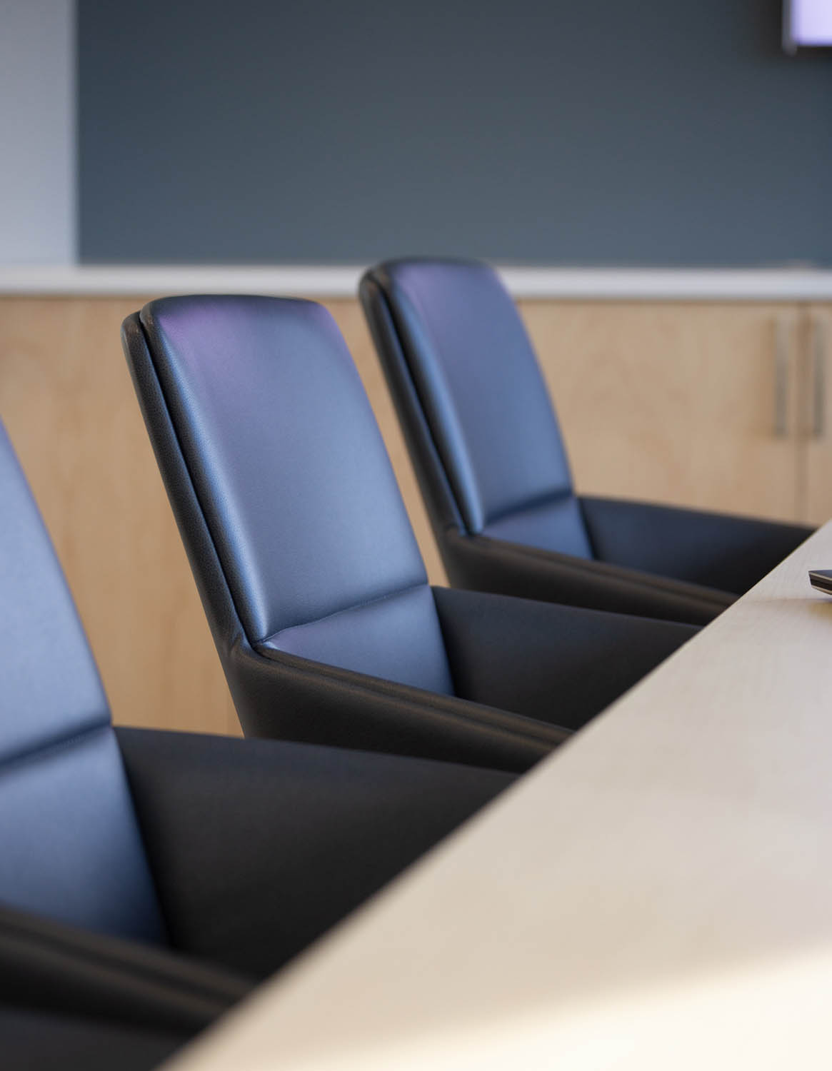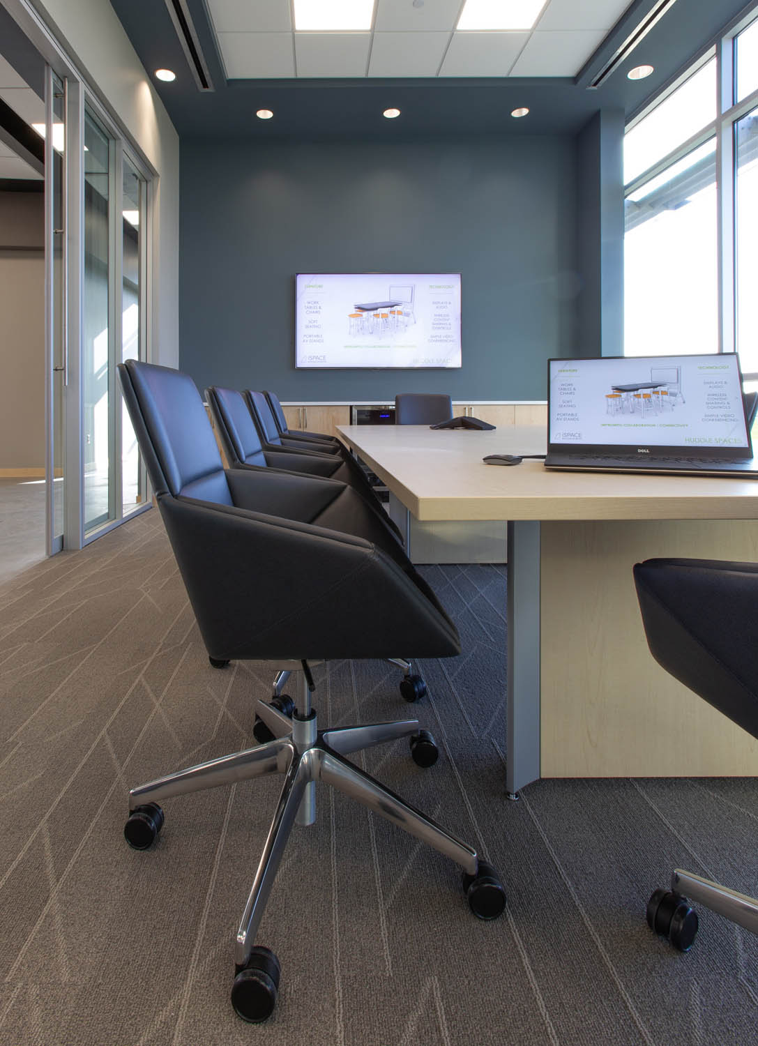 ClickShare content sharing enable a handsome, west-facing conference room complete with Allermuir’s Phoulds conference seating and Studio TK Qui Ottomans. Qui are used liberally throughout the meeting and workspaces to further support ad hoc collaboration.