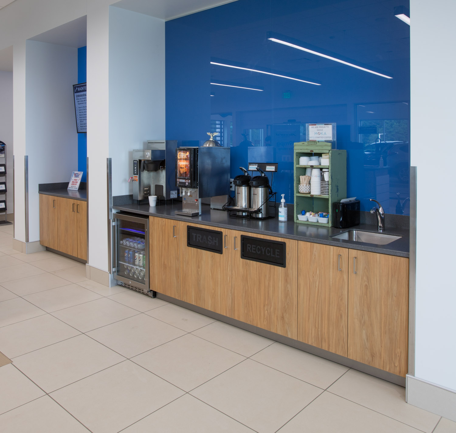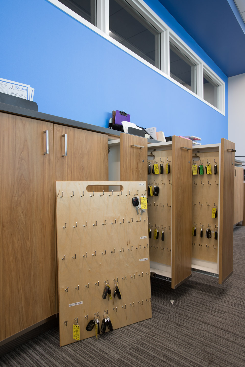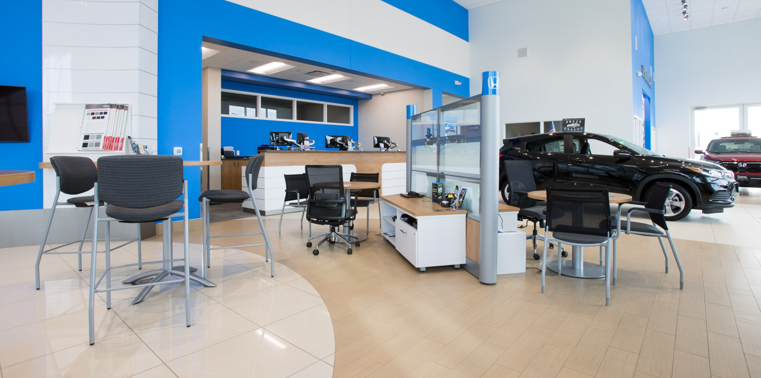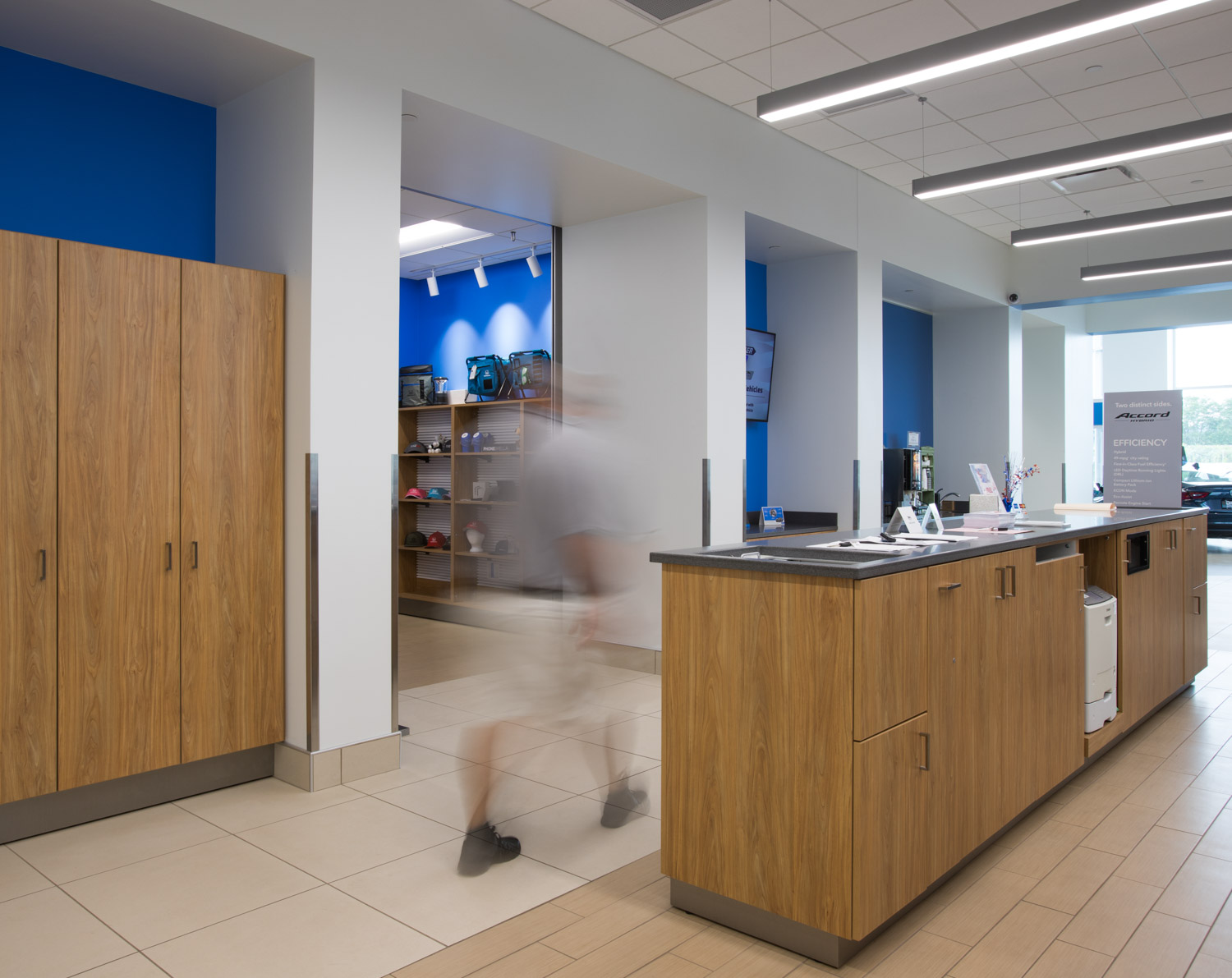 Unique solutions required for this dealership location included a customized service counter with top-opening tambour-door filing solutions and specialized key storage compartments. Stephanie Serre, iSpace Environments Retail Designer, works closely with the dealership team to assure furniture, finishes and equipment specifications will be approved by the auto manufacturer, Honda. Though construction and installation occurred during the pandemic closures, the project experienced almost no delays.
